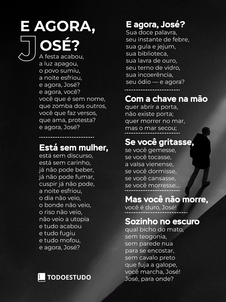 - José (1942): uma coletânea curta, com 12 poemas. “José” é o livro responsável por trazer à cena cultural o icônico poema “José”. Ainda aflito com as questões sociais e influenciado pelos horrores da Segunda Guerra, Drummond reflete sobre a solidão, o sentimento de impotência e de culpa, como no poema “A mão suja”. Além disso, reflete mais explicitamente sobre a linguagem, expressa no poema “O lutador”.