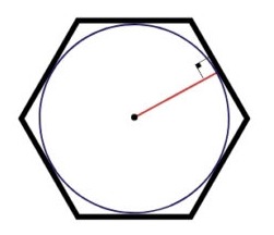 Em um hexágono regular, o lado e o raio circunscrito têm a mesma medida. Dessa maneira, a medida do segmento de reta perpendicular ao lado até o seu centro geométrico é dada por: a= r cos θ.